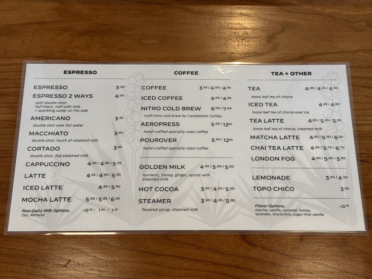 As a reviewer looking back at the menu of Plata Coffee, what stands out most is its focused, thoughtfully curated selection that celebrates both craftsmanship and simplicity. The espresso lineup-ESPRESSO, ESPRESSO 2 WAYS, AMERICANO, MACCHIATO, and CORTADO-highlights a deep respect for classic coffee traditions, offering guests multiple ways to experience the same high-quality beans through different textures and intensities. Moving into the brewed coffee options, choices like COFFEE, ICED COFFEE, NITRO COLD BREW, AEROPRESS, and POUROVER show the café’s commitment to versatility, catering equally to those who prefer something refreshing, smooth, or carefully hand-crafted. The menu is rounded out nicely with non-coffee offerings under Tea + Other, including GOLDEN MILK, TEA, ICED TEA, TEA LATTE, and MATCHA LATTE, ensuring that every guest-whether a coffee enthusiast or not-can find something comforting and well-made. Overall, the menu does not try to overwhelm with excess, but instead delivers a balanced, high-quality range of drinks that reflects confidence, consistency, and a clear understanding of what a neighborhood coffee shop should offer.
